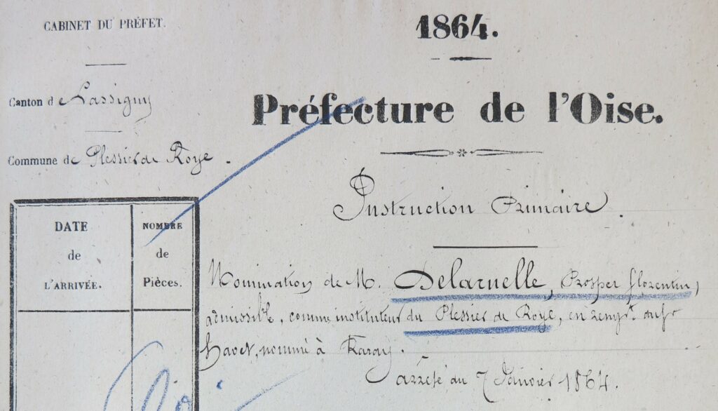 Sa toute première nomination en tant qu’instituteur communal se fait à l’école du Plessier-de-Roye (Oise), par arrêté du préfet de l’Oise en date du 7 janvier 1864.