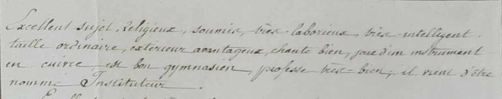 « Excellent sujet, religieux, soumis, très laborieux, très intelligent, taille ordinaire, extérieur avantageux, chante bien, joue d’un instrument en cuivre, est bon gymnasien, professe très bien ; il vient d’être nommé Instituteur. »