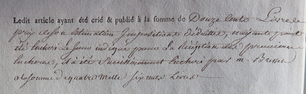 Sa mise à prix est de 1200 livres. Dans un premier temps, elle ne trouve pas d’enchérisseurs.